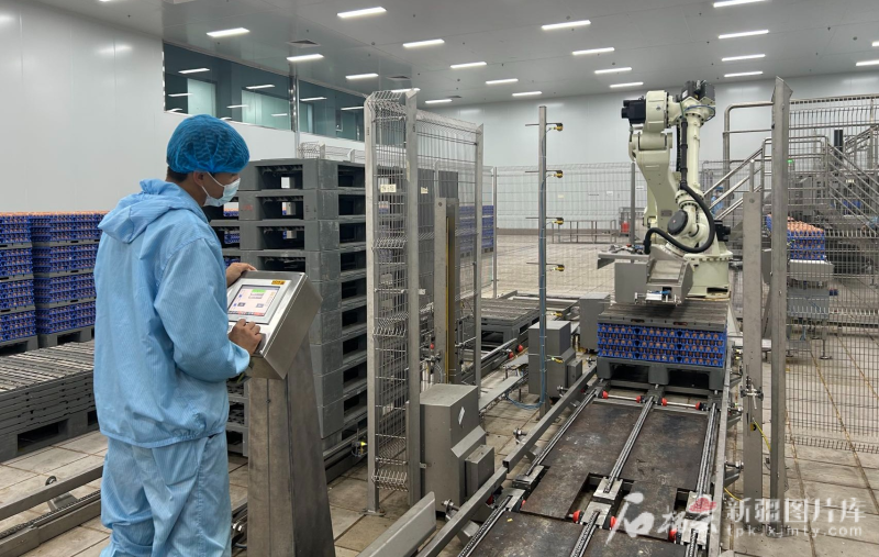8月14日,新疆西帕健康食品有限公司员工在查看机械臂运作情况。石榴云/新疆日报记者 宋卫国摄 8月14日,“对口援疆 潮涌天山”主题采访团记者在西帕食品上蛋车间看到,一只巨大的机械臂正在不断抓取一盘盘鸡蛋放到传送带上,鸡蛋通过清洗、消杀等前处理工序后,来到磕蛋设备环节,通过机械破壳、分离后分别获得蛋白液、蛋黄液和全蛋液产品,再通过喷雾干燥设备加工制成蛋白粉、蛋黄粉和全蛋粉。一袋袋凝聚着高科技含量的鸡蛋精深加工产品最终走下生产线。 西帕食品董事长张伟介绍,每一枚鸡蛋内富含的营养元素有高有低,比如溶菌酶在每一枚鸡蛋内含量仅3‰,因此需要更多蛋白液原料进行提取。西帕食品目前已投产溶菌酶提取线,同时获取了蛋黄磷脂多肽生产许可。 “现在除了上蛋车间、包装车间、数字监控平台等岗位需要人工辅助,其他主要生产过程都已经实现了无人操作。”张伟说。 西帕食品在科技上投入了大量力量。在博乐市人民政府的支持下,西帕食品携手江南大学共同成立了丝路食品创新研究院。科研人员从小小的鸡蛋当中解开了一个又一个生物密码,目前已经申报超过10项发明专利、8项实用新型专利,近期新疆蛋制品精深加工工程技术研究中心获批。 为了满足每天50万枚鸡蛋的生产需求,西帕食品就近从博乐市小营盘镇及疆内规模型养殖场选购原料。2024年,西帕食品实现了5000万元产值。 阿孜吾买尔·艾买塔洪笑着说,他在企业工作了一年,已经从一名普通工人成长为包装车间组长,现在每个月工资5000多元。“我从来没有想到一枚小小的鸡蛋能变成如此大的产业,能在这样的高科技企业工作实在太自豪了。”