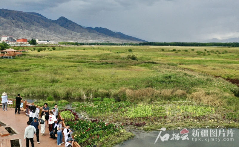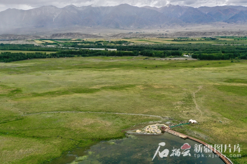 8月15日,俯瞰温泉县博尔塔拉河国家湿地公园。(无人机摄) 2024年8月,根据创建国家级旅游度假区的需要,温泉县规划实施了3处露天温泉体验区,其中在温泉湿地建有2处,县城南入口1处,总投资1500万元,均为援疆资金。温泉之翼体验区今年5月正式投运。该项目以“水天结合、展翅翱翔”为理念,分为温泉之翼和百米温廊2处,共计19个泡池,是最受市民和游客欢迎的一处免费体验温泉业态的亲水平台。