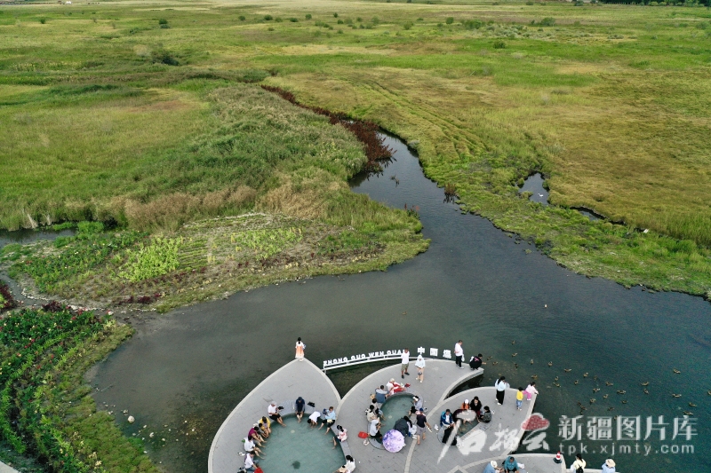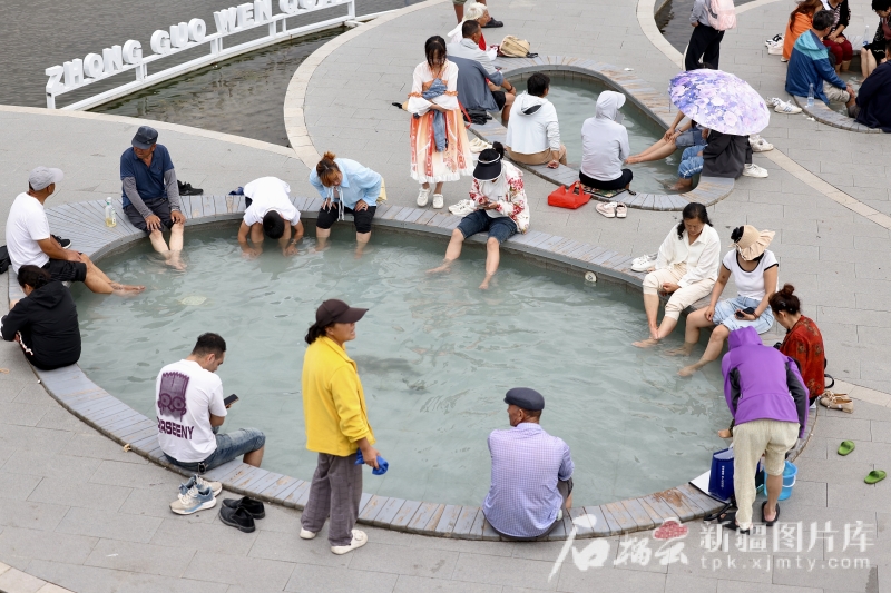 石榴云/新疆日报讯(记者 李瑞摄影报道)8月15日,“对口援疆 潮涌天山”主题采访活动成员来到温泉县。当天,记者走进温泉县博尔塔拉河国家湿地公园看到许多游客在露天温泉体验区泡脚。
