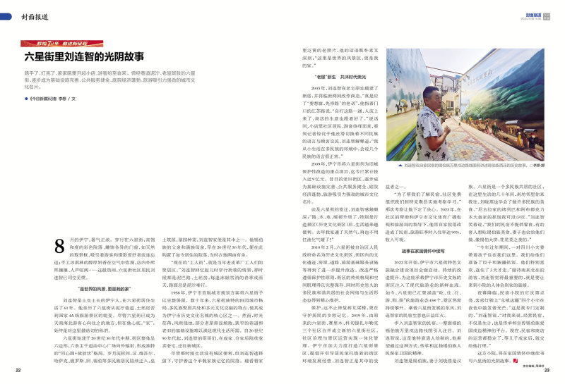 路平了,灯亮了,家家院里开起小店,游客纷至沓来。曾经巷道泥泞、老屋斑驳的六星街,逐步成为基础设施完善、公共服务健全、庭院经济蓬勃、旅游吸引力强劲的城市文化名片。 ● 《今日新疆》记者 李想 / 文 8月的伊宁,暑气正浓。穿行在六星街,高饱和度的彩色院落、雕饰各异的门窗,如天然的取景框,吸引着游客和摄影爱好者流连忘返;手工冰淇淋的醇厚奶香在空气中弥漫,店内外熙熙攘攘、人声喧阗……这般热闹,六星街社区居民刘连智已司空见惯。 “是世界的风景,更是我的家” 刘连智是土生土长的伊宁人,在六星街居住生活了61年。他亲历了六星街从泥泞巷道、土坯房舍到国家4A级旅游景区的蜕变。尽管六星街已成为天南海北游客心向往之的地方,但在他心底,“家”,始终是对这里最贴切的称谓。