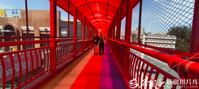 9月1日,市民正走在乌市水磨沟区北郊客运站附近的彩色天桥上。石榴云/新疆日报记者 胡大敏摄 乌鲁木齐市水磨沟区城市管理局(城市管理行政执法局)相关工作人员介绍,北郊客运站附近过街天桥年久失修,桥体老旧,地面、楼梯坑洼,去年,乌鲁木齐一家文旅企业在天桥附近建成了集吃喝玩乐为一体的文创旅游公园,为了将桥体外观和文创旅游公园整体风格保持一致,水磨沟区将北郊客运站附近过街天桥的维修交给这家文旅企业负责。 负责这次北郊客运站附近过街天桥维修的新疆盛合投资有限公司相关负责人介绍,去年,他们对天桥外观进行了粉刷,“由于资金原因,去年天桥坑洼、破损的桥面和楼梯没及时维修,最近,我们再次组织施工单位对天桥进行了施工,将天桥粉刷成不同颜色,将打造成乌鲁木齐第一座彩色网红天桥。”