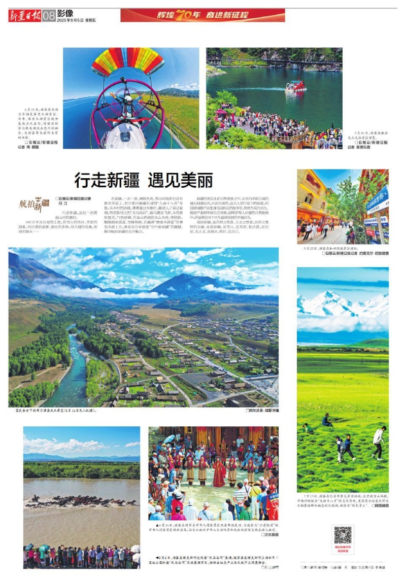 石榴云/新疆日报记者 任江 行走新疆,是赴一次跨越山河的邀约。 166万平方公里的土地,有雪山的伟岸,草原的温柔;有沙漠的寂寥,湖水的多情;有古城的沧桑,街巷的烟火…… 在新疆,一步一景,满眼大美。雪山环抱的巴音布鲁克草原上,有开都河蜿蜒而成的“九曲十八弯”奇景;禾木村的清晨,薄雾漫过木栅栏,像进入了童话秘境;特克斯河上的“天马浴河”,骏马踏浪飞奔,水花映射霞光,气势磅礴。在高山碧湖的天山天池、喀纳斯,触摸湖面湛蓝、雪峰倒映,在盛满“赛里木湖蓝”的赛里木湖上空,乘坐动力伞感受“空中看新疆”的震撼,探寻航拍新疆的无穷魅力。 新疆的美岂止在自然美景之中。吉木乃草原石城的通天洞遗址内,扑面而来的,是古人前行留下的温度;和田团城棚户区变身花园街区的故事里,传统与现代共生,旅游产业和幸福生活共舞;尉犁罗布人村寨的古老歌舞中,洋溢着追寻千百年最终获得的幸福时光。 美丽新疆,是自然之绝美、人文之厚重、民俗之独特的交融。走进新疆,见雪山、见草原、见沙漠,见历史、见人文、见烟火,然后,见自己。