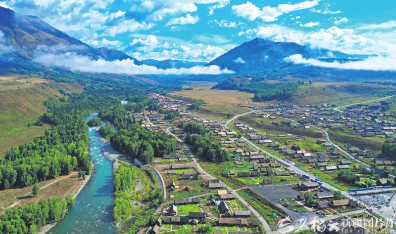蓝天白云下的布尔津县禾木景区(8月16日无人机摄)。□阿尔达克·拜斯汗摄