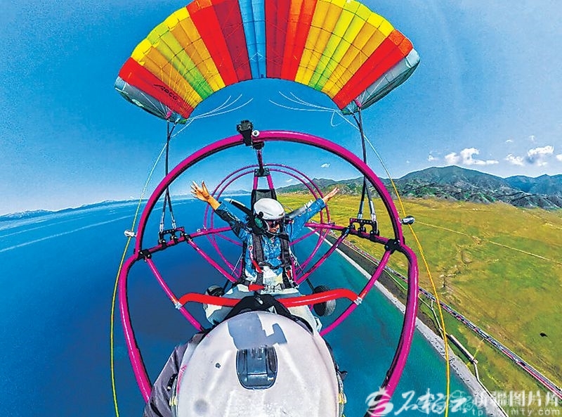 6月25日,游客乘坐动力伞游览赛里木湖景区。今年,赛里木湖景区跳伞基地正式启用,将低空经济与绝美湖光山色巧妙融合,为游客带来前所未有的体验。□石榴云/新疆日报记者 周鹏摄