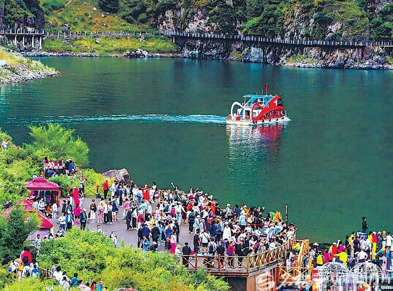 7月31日,游客乘船在天山天池景区游览。□石榴云/新疆日报记者 蔡增乐摄