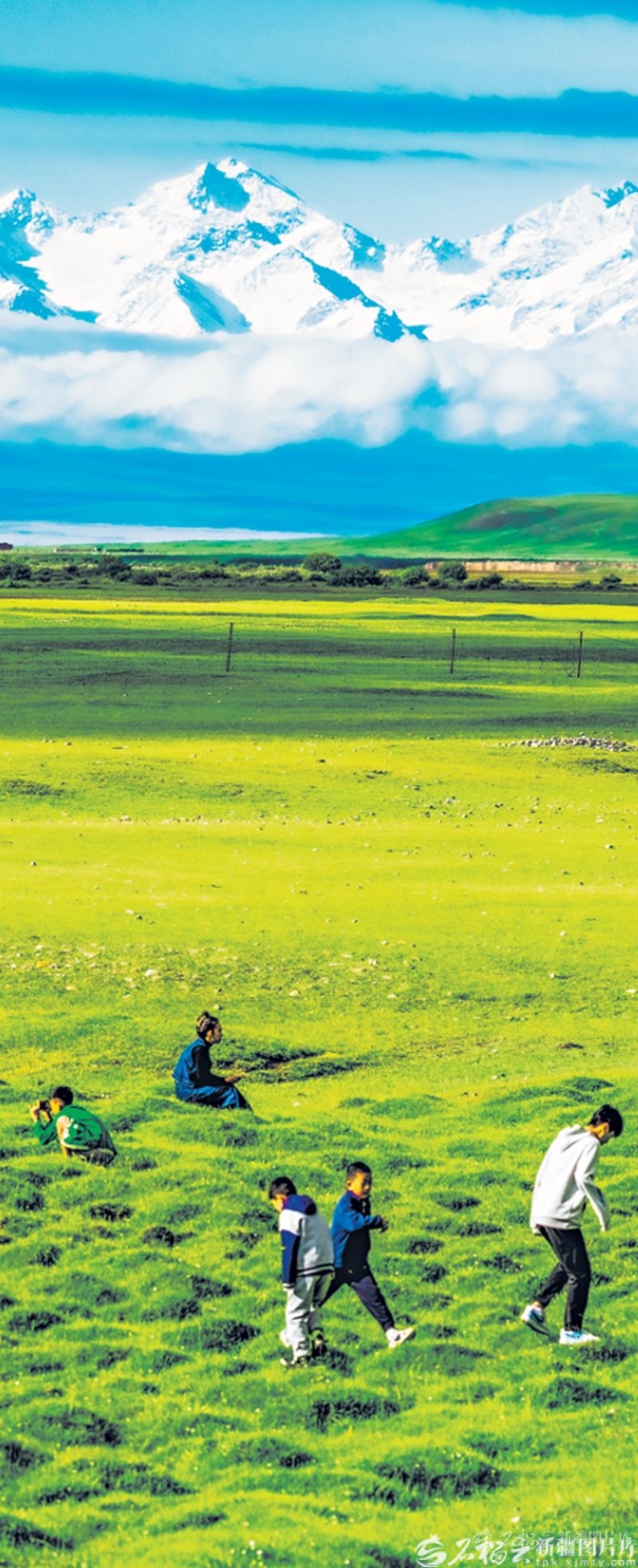7月13日,游客在巴音布鲁克草原游玩。这里被雪山环抱,开都河蜿蜒出“九曲十八弯”的自然奇观,更因有全球最大野生天鹅繁殖群体栖息的天鹅湖,被誉为“绿色净土”。□田国建摄
