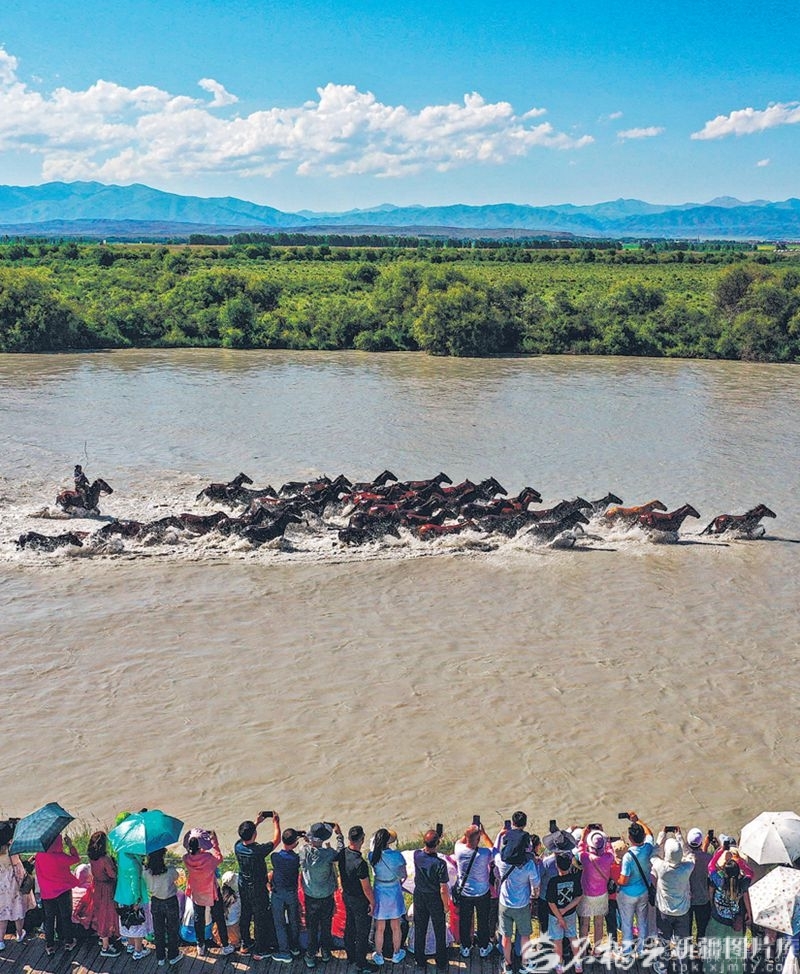 8月6日,游客在特克斯河边观看“天马浴河”表演。昭苏县在特克斯河上游的国家湿地公园打造“天马浴河”文旅表演项目,推动当地马产业与文旅产业深度融合。□张庆华摄