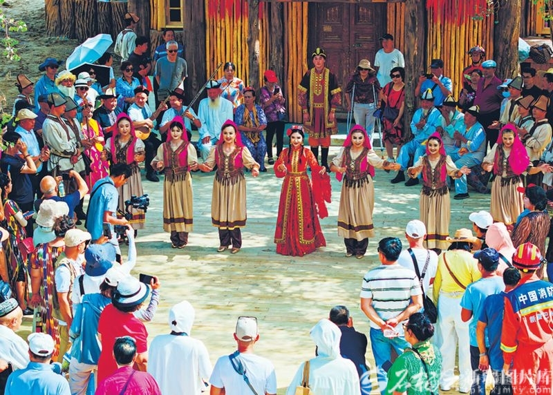 8月30日,游客在尉犁县罗布人村寨景区观看舞蹈表演。当被誉为“沙漠桃源”的罗布人村寨景区焕新启幕,壮美如画的罗布人生活场景和民俗风情便呈现在游人面前。□汪志鹏