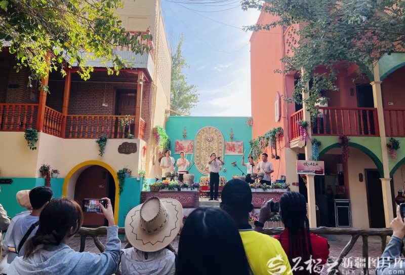 9月5日,留学生在吐鲁番葡萄沟风景区观看表演。石榴云/新疆日报记者 司路路摄
