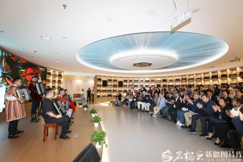 9月11日,参访团成员在伊宁市六星街手风琴展示馆内欣赏手风琴表演。刘成刚摄