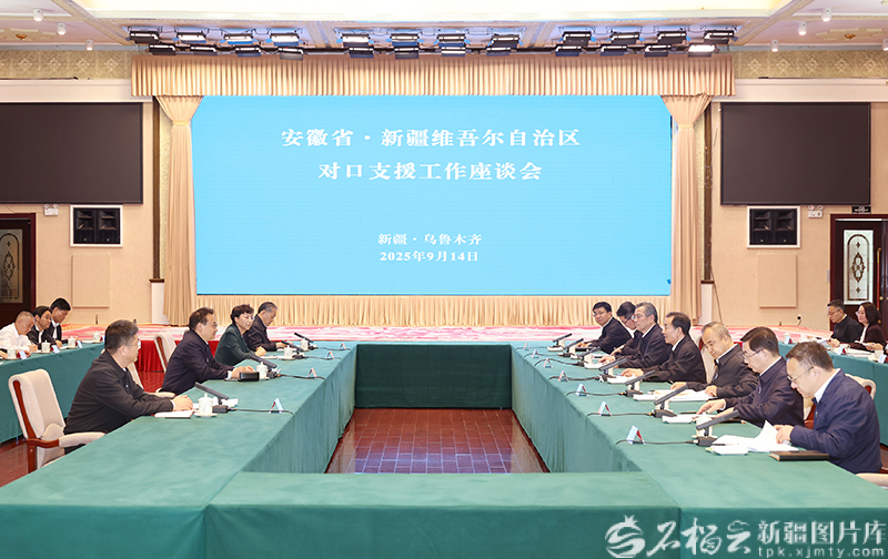 9月14日,安徽省·新疆维吾尔自治区对口支援工作座谈会在乌鲁木齐召开。石榴云/新疆日报记者 崔志坚摄 石榴云/新疆日报讯(记者 王兴瑞 张艳芳报道)9月13日至14日,安徽省党政代表团来新疆考察对接对口援疆工作。双方举行工作座谈会,深入贯彻习近平总书记关于新疆工作的重要讲话重要指示批示精神,落实第十次全国对口支援新疆工作会议部署,进一步推动对口援疆工作和新皖务实合作走深走实。安徽省委书记梁言顺,自治区党委书记陈小江,自治区党委副书记、自治区主席艾尔肯·吐尼亚孜,自治区党委副书记、兵团政委何忠友参加有关活动。 14日下午,安徽省·新疆维吾尔自治区对口支援工作座谈会在乌鲁木齐召开。梁言顺代表安徽省委、省政府对新疆长期以来给予安徽发展的支持表示感谢,对新疆经济社会发展取得的成就表示祝贺。他说,自2010年以来,安徽认真贯彻习近平总书记重要讲话重要指示精神和党中央决策部署,深入实施扶智、富民、安居、连心、固本“五大工程”,有力促进了和田及皮山社会稳定和经济发展。今年是新疆维吾尔自治区成立70周年。我们将立足新的起点,坚决扛牢对口援疆重大政治责任,充分发挥安徽和皮山两个方面优势,科学谋划“十五五”对口援疆目标任务,实施一批牵动性强的重大项目、重大工程,持续深化产业援疆、教育援疆、医疗援疆、人才援疆、文化润疆,助力皮山增强发展动能,推进群众增收,促进民族团结,推动实现供需匹配、相互赋能、共同发展,齐心协力把对口援疆工作推向深入。 陈小江代表自治区党委和政府欢迎安徽省党政代表团到来,感谢安徽省倾力援助和安徽援疆干部人才无私奉献。他说,习近平总书记高度重视新疆工作、情系新疆各族人民,党中央举全国之力支持新疆建设发展,充分彰显了党的领导、社会主义制度和中国特色解决民族问题正确道路的独特优势。安徽省把对口援疆作为重大政治责任,聚焦民生、产业、智力、文化多点发力,办成一批惠及民生的实事好事,有力推动了受援地经济社会发展和民生改善,新疆各族人民感恩在心。今年是自治区成立70周年,新疆将认真落实第十次全国对口支援新疆工作会议部署,发挥受援地积极性,提高对口援疆综合效益,深化与安徽合作对接,携手推进中华民族共同体建设,促进重点产业发展,扩大高水平开放,在中国式现代化进程中谱写新皖合作新篇章。 座谈会上,双方有关领导分别汇报了自治区经济社会发展和与安徽交流合作情况、安徽经济社会发展和对口支援工作情况。 在疆期间,代表团来到和田地区皮山县,走进种植基地、学校等地考察援疆工作进展成效,深入座谈交流,看望援疆干部人才。 安徽省领导孙红梅、单向前、张曙光,自治区领导陈伟俊、哈丹·卡宾、王琳、王刚参加有关活动。