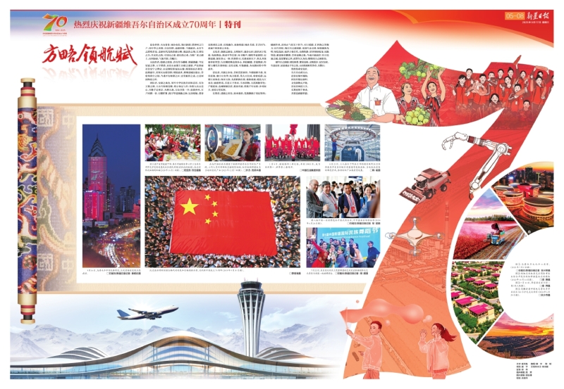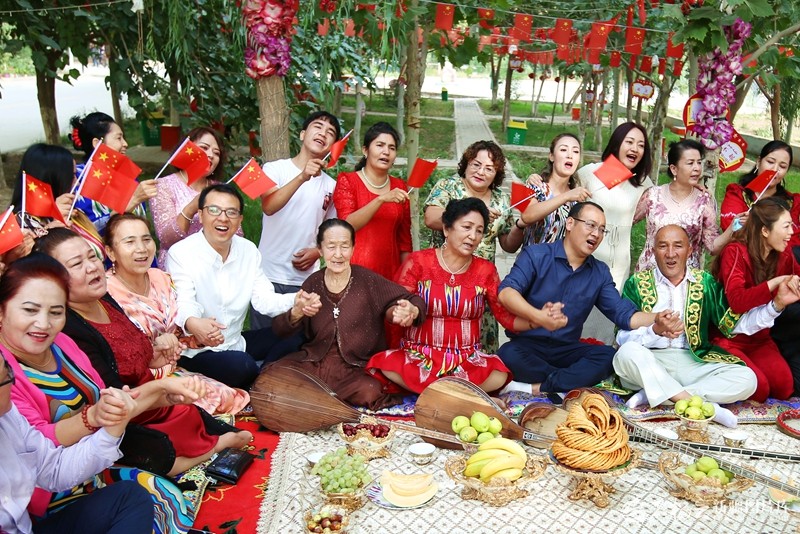 托克逊县博斯坦镇吉格代村村民和巨幅国旗合影,庆祝新中国成立70周年(2019年9月30日摄)。李靖海摄 文化者,润疆之脉也。文明如川,滋养心田,润认同于化境。龟兹舞态,跃动中华艺韵;木卡姆声,颂唱华夏深情。史教浸润,深识多元一体;经典传习,长系家国天下。坎儿井汲取中原智慧;左公柳照映边塞乡心。科技赋能,非遗焕新,传统与现代共奏和弦;文化交流,互鉴融通,各民族同传中华薪火。