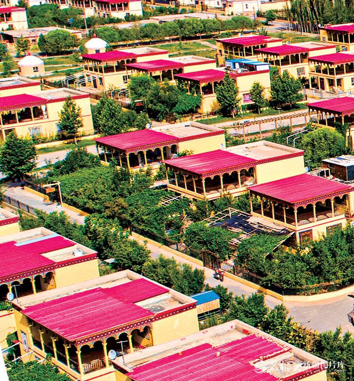 7月10日,泽普县美丽乡村一角(无人机摄)。金炜摄 观今日之新疆:团结和谐、繁荣富裕、文明进步、安居乐业、生态良好。昆仑见证千年之变,天山铭刻时代华章。乃赞曰: 煌煌伟业安边计, 片片丹心照天山。 法治宏规平瀚海, 团结厚德定疆垣。 文化润物无声处, 富民春风度玉关。 长期更铸千秋业, 共谱边疆盛世篇。
