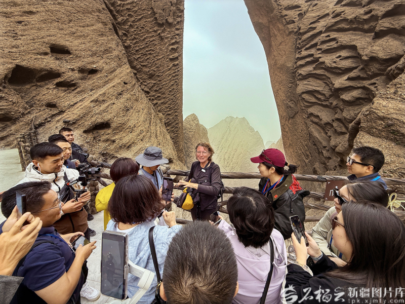 9月16日,“走进美丽新疆”全国省级媒体采风活动采访团记者在阿图什天门景区采访来自法国的游客。