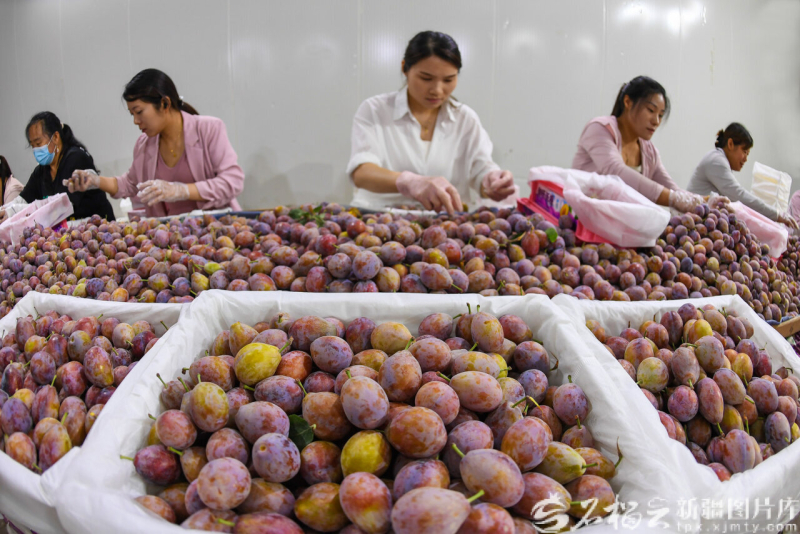 8月12日,伽师县粤伽新梅现代产业园工人在冷链仓储物流分选区将新梅进行分选。