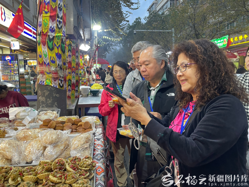 9月14日下午,北美洲台湾乡亲联谊会参访团一行参访新疆国际大巴扎。石榴云/新疆日报记者 索蓉芝摄 傍晚时分,参访团一行来到了新疆国际大巴扎,眼前是琳琅满目的特色商品,耳畔是热闹愉悦的交谈声,浓郁的城市活力与烟火气息扑面而来。“在热闹的巴扎里选购新疆特产,周围各族群众或热情地介绍商品,或通过直播售卖商品,脸上都洋溢着轻松惬意的笑容,人与人之间的互动真诚又自然,让人心里充满暖意。”参访团成员赖文娟说。 夜晚,和田二街的美食与夜景,更让参访团一行体验到新疆丰富的夜生活与浓郁的民俗风情。 “烤包子、一把抓、烤全羊、酸奶粽子……每一样食物都很美味,真的有留在新疆居住的打算。”赖文娟笑着说:“不光有美景美食,新疆的商品也很有特色。耳边是商贩的吆喝声、游客的笑声,这种热闹又亲切的氛围,让我真切感受到了新疆的烟火气。”