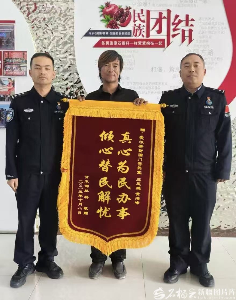 石榴云/新疆日报讯(记者 王琦铭报道)宁夏籍货车司机杨师傅继续跑车了。在离开霍尔果斯前,专门到国门警务室,送上一面印着“真心为民办事,倾心替民解忧”的锦旗。 “要是没有你们,我这趟4000多公里不仅白跑,还得亏不少油费、过路费,损失将近3万元呀!”杨师傅说,他要感谢新疆出入境边防检查总站伊犁边境管理支队霍尔果斯边境管理大队国门警务室民警王玉鹏、黄海峰。