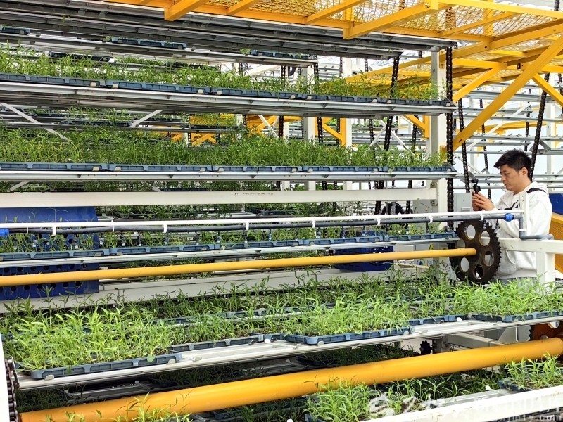 10月13日,乌鲁木齐市米东区羊毛工镇新建村水稻示范园智慧育秧工厂,技术人员正在查看蔬菜苗生长情况。 石榴云/新疆日报讯(记者 李雄心摄影报道)10月13日,乌鲁木齐市米东区羊毛工镇新建村水稻示范园智慧育秧工厂内,伴随着传送带匀速转动,智能播种机精准地将番茄种子、辣椒种子嵌入育苗盘。