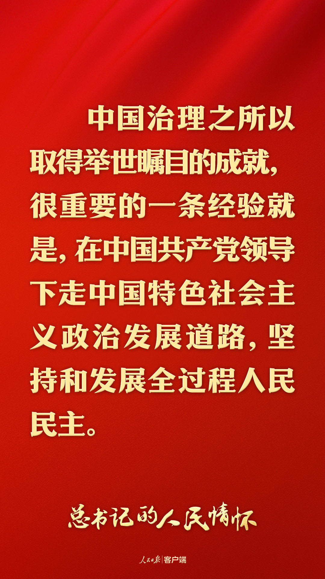 习近平总书记指出:“中国治理之所以取得举世瞩目的成就,很重要的一条经验就是,在中国共产党领导下走中国特色社会主义政治发展道路,坚持和发展全过程人民民主。” “没有民主就没有社会主义,就没有社会主义的现代化,就没有中华民族伟大复兴。”习近平总书记身体力行,引领推动。今天,广泛、真实、管用的民主在神州大地焕发勃勃生机。 发展全过程人民民主,映照初心使命—— 2021年11月5日,是北京市区和乡镇两级人大代表换届选举投票日。 北京市西城区中南海选区怀仁堂投票站里,习近平总书记仔细听取有关选举事项的说明,拿出选民证交给工作人员核验,领取一张选票,在写票处认真填写选票后,走到票箱前郑重投下自己的一票。 在中国,每一个地区、每一个行业、每一个领域、每一个民族都有人大代表,人大代表具有广泛的代表性。 “人民当家作主是社会主义民主政治的本质和核心。”习近平总书记念兹在兹。 2021年6月25日,习近平总书记带领十九届中共中央政治局同志来到北大红楼。展厅内,刊载着李大钊名篇《庶民的胜利》的《新青年》杂志原件前,总书记细细观看。 “人民民主是中国共产党始终高举的旗帜。” “我们国家的名称,我们各级国家机关的名称,都冠以‘人民’的称号,这是我们对中国社会主义政权的基本定位。” 深深扎根人民,始终为了人民,这份初心从未改变。 发展全过程人民民主,共创美好生活—— 民法典的颁布实施,实现了几代人的夙愿。先后10次公开征求意见,征集到各方面意见100余万条,许多意见被吸收采纳……为了编纂好这部充分保障人民权益的新时代法典,习近平总书记3次主持中共中央政治局常委会会议,对编纂工作作出重要指示。 “民主不是装饰品,不是用来做摆设的,而是要用来解决人民需要解决的问题的。” 发展全过程人民民主,汇聚磅礴力量—— “从什么时候开始改造?” “遇到的主要困难是什么?” 2019年春节前夕,习近平总书记走进北京市东城区草厂四条胡同,饶有兴味加入一场讨论——来自街道、社区、居民等方面代表,正在“小院议事厅”召开胡同院落提升改造恳谈会。 习近平总书记指出,设立“小院议事厅”,“居民的事居民议,居民的事居民定”,有利于增强社区居民的归属感和主人翁意识。 食品安全,乡村全面振兴,新质生产力……党的十八大以来,每年全国两会期间,习近平总书记都会参加团组审议讨论,听取代表委员发言,同大家共商国是。人民的所思所盼装在领袖心中,融入国家发展。 “大鹏之动,非一羽之轻也;骐骥之速,非一足之力也”,总书记引用这句古语,意味深长。 当14亿多人民的磅礴力量被激发出来、汇聚起来,以中国式现代化全面推进强国建设、民族复兴伟业必将不断开创新局面。 策划:田俊荣 刘晓鹏 监制:杨学博 陈振凯 余荣华 统筹:李翔 朱利 吴玥 李洋 视频:安博文 皇甫凌雨 岳小乔 冯慧文 海报:王宇峰 校检:朱利 李金昱