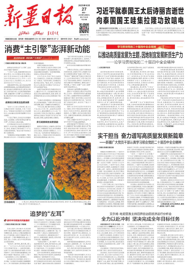 石榴云/新疆日报记者 黑宏伟 消费是经济增长的“主引擎”,也是民生幸福的“晴雨表”。 “十四五”以来,新疆消费市场实现稳定增长:社会消费品零售总额从2021年的3584.62亿元稳步攀升至2024年的3926.45亿元;今年1—8月达2623.7亿元,同比增长5.3%,高于全国平均水平0.7个百分点。 亮眼成绩单背后,是自治区促消费政策的精准落地,是消费结构的持续升级,更是超大规模市场活力的充分释放。从城市到乡村,从实物消费到服务消费,新疆消费“主引擎”正以澎湃新动能,推动经济巨轮在高质量发展航道上稳健前行。 政策组合拳激活品质消费