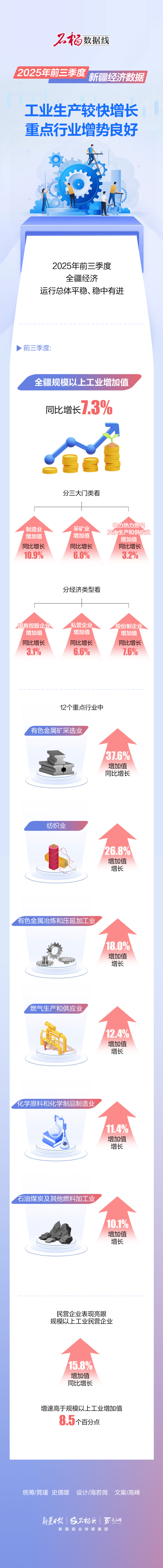 2025年前三季度,全疆规模以上工业增加值同比增长7.3%。分三大门类看,制造业、采矿业、电力热力燃气及水生产和供应业增加值同比分别增长10.9%、6.0%、3.2%。分经济类型看,国有控股企业、私营企业、股份制企业增加值同比分别增长3.1%、6.6%、7.6%。 12个重点行业中,有色金属矿采选业增加值同比增长37.6%、纺织业增加值增长26.8%、有色金属冶炼和压延加工业增加值增长18.0%、燃气生产和供应业增加值增长12.4%、化学原料和化学制品制造业增加值增长11.4%、石油煤炭及其他燃料加工业增加值增长10.1%。 民营企业表现亮眼,规模以上工业民营企业增加值同比增长15.8%,增速高于规模以上工业增加值8.5个百分点。 统筹/晁瑾 史儒雄 设计/海若微 文案/高峰