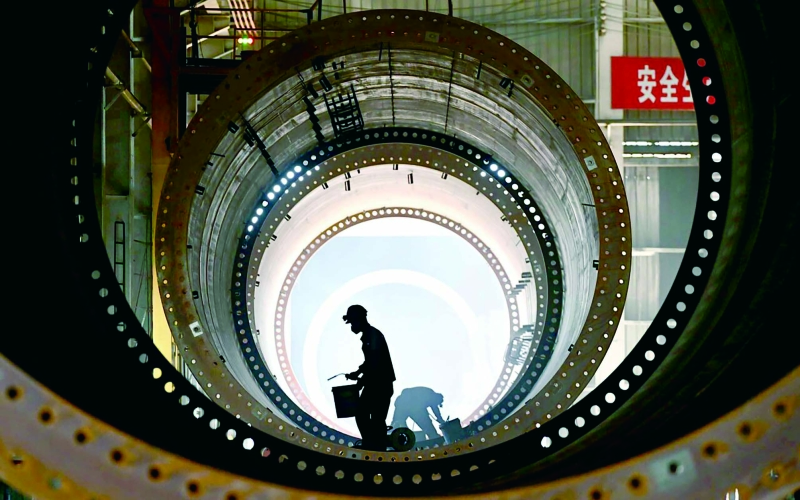 工人在生产线上生产风力发电机塔筒。李瑞/摄