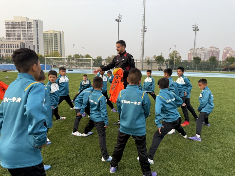 10月23日,在天津团泊体育中心绿茵场,天津专业教练团队的教练员训练“足球小巴郎”们的协同意识。李凌燕 摄 天津市对口支援新疆工作前方指挥部宣传交流部副部长夏立樑说:“自2010年天津对口支援和田以来,两地合作不断深化,此次活动正是‘津和情深’的生动实践。天津援疆将谋划推进‘石榴籽一家亲’‘足球小巴郎’品牌打造,不断丰富学习交流活动,为受援地青少年提供开阔视野、提升技能的平台,推动两地青少年交往交流交融,铸牢中华民族共同体意识。”