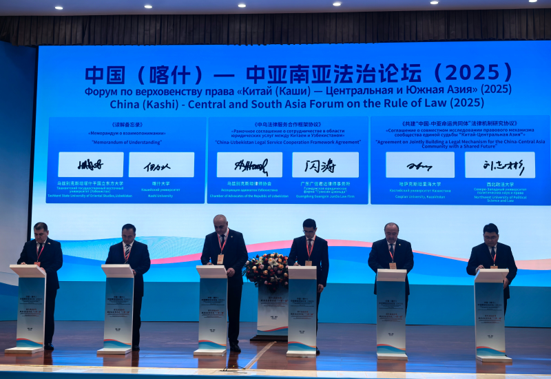 10月30日,由新疆法学会、广东省法学会、中国法学学术交流中心主办的中国(喀什)—中亚南亚法治论坛(2025)在喀什市举行。论坛举行期间,签署了多项合作协议。石榴云/新疆法治报记者 郑旭磊摄 石榴云/新疆法治报记者 房佳伟 “丝路明珠”喀什,再次迎来高光时刻。 10月30日,由新疆法学会、广东省法学会、中国法学学术交流中心主办的中国(喀什)—中亚南亚法治论坛(2025)在喀什市举行。中国、中亚和南亚11个国家及阿塞拜疆、马来西亚等国家代表出席,围绕“深化法治合作 服务高质量共建‘一带一路’”这一主题深入交流研讨,为构建更加紧密的区域命运共同体贡献法治智慧和力量。 论坛智库纽带作用凸显 汇聚法治合作共识 创新举措落地落实 共建“一带一路”是开拓造福各国、惠及世界的“幸福路”,面对国际合作新挑战,法治全程护航。 2023年10月举办的首届中国(喀什)—中亚南亚法治论坛发布《深化“一带一路”法治合作倡议书》,提出推动完善国际司法协助工作机制、开展法学教育领域交流合作等10项务实举措,共同擘画法治合作愿景。 此次论坛集中展示的丰硕成果,凸显了两年来各方依托论坛纽带作用,推动执法司法合作与法学交流走深走实,深化人才培养,共同织密区域法治“软联通”网络,为高质量共建“一带一路”提供有力支撑。 ——2024年9月24日,自治区高级人民法院首次承办中国—中亚国家最高法院院长会议,建立中亚国家司法合作交流基地,深入拓展共建“一带一路”国家司法领域务实合作。 ——深圳国际仲裁院在新疆面向中亚、南亚的重点口岸城市或口岸设立代表处、咨询联络处,助力中外企业防范和化解跨境商事纠纷,以高质量国际仲裁服务“一带一路”共建国家经济高质量发展。 ——《中国(新疆)自由贸易试验区条例》《新疆维吾尔自治区优化营商环境条例》等一系列重要法规出台,乌鲁木齐丝绸之路经济带法务区、喀什“法智谷”、霍尔果斯驿路国际法务区实体运作、协同发展;中国国际贸易促进委员会中亚庭审中心、中亚调解中心落地;新疆律师事务所“走出去”,在中亚等国设立12个境外服务网点,不断提升涉外法律服务质效。 ——中国政法大学依法治疆研究院揭牌成立,首届中国—中亚法治文明交流互鉴大会成功举办,推动建立中国—中亚法学教育联盟;中国—上海合作组织国际司法交流合作培训基地涉外人才研修中心(乌鲁木齐)、中国—上海合作组织经贸学院乌鲁木齐涉外法治培训中心建成;“丝路英才”涉外律师人才库组建,签订《涉外法律服务合作框架协议》,锻造一支高素质涉外律师队伍。 ——新疆法学会委托自治区人民检察院完成重大法学研究课题《涉中亚国家司法检察制度和司法协作机制建设研究》,出版《中亚国家检察制度概述》;组织开展“一带一路”框架下中哈霍尔果斯国际边境合作中心民商事纠纷解决路径研究,探索建立民间仲裁、调解、诉讼三位一体的国际争端解决机制,填补了新疆自贸试验区民商事纠纷解决领域研究空白。 建言献策共绘发展蓝图 强化法治合作服务 高质量共建“一带一路”