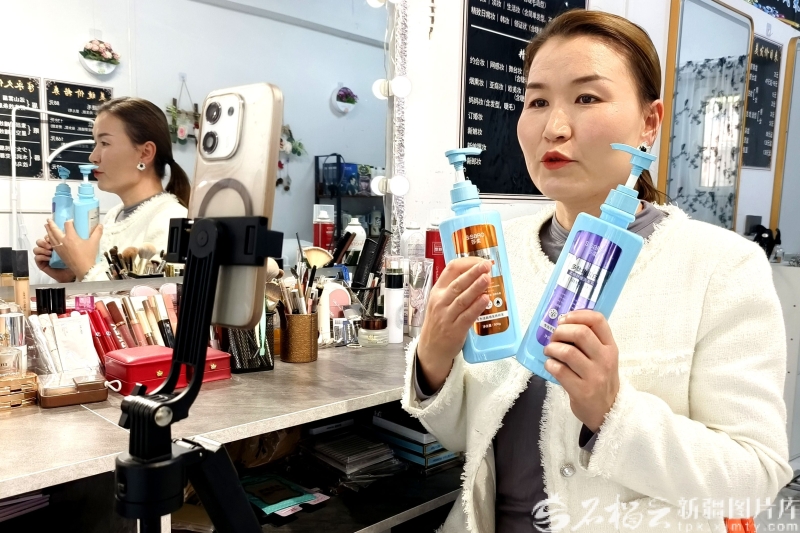 10月31日,巴合提古丽·阿克万通过网络直播推广美容洗涤用品。加尔肯别克·特尼斯别克 摄 2020年底,巴合提古丽·阿克万来到乌鲁木齐市学习美容美发。2021年,她在家开了一间理发店,迈出创业第一步。2022年,凭借扎实手艺和良好口碑,她将店铺迁至村中心,客源逐步稳定。2025年9月,她的创业之路再升级,在城区开设专业美容店,专做婚礼美妆、新娘造型。 创业路上,乌鲁木齐市达坂城区妇联为她提供了精准扶持。2024年,妇联为她送上价值1.5万元的理发店物资,解决设备更新燃眉之急,还安排她参加市级美容美发提升培训,其凭借优异表现获评优秀学员。2025年6月,当地妇联推荐她赴广州参加了为期十天的美甲美剪高级课程。她在80名学员中脱颖而出,在相关赛事中获得美甲第一名、纹绣第二名的佳绩。培训归来后,妇联再送价值1.38万元的美甲美睫物资及1万元扩容资金,帮她拓展业务。 巴合提古丽·阿克万还聘用本村女孩并传授理发技艺,带动乡亲们就业增收。