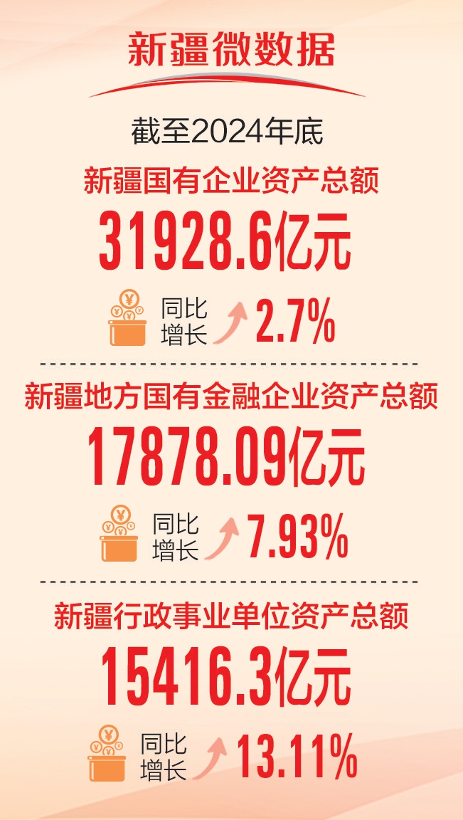 石榴云/新疆日报记者 冉虎 10月14日,自治区人民政府提请自治区十四届人大常委会第二十四次会议审议《关于2024年度国有资产管理情况的综合报告》,亮出了2024年新疆国有资产的“家底”。 《报告》显示,截至2024年末,新疆国有资产总额65222.99亿元,其中:国有企业(不含金融企业,下同)资产总额31928.60亿元、金融企业资产总额17878.09亿元、行政事业性资产总额15416.30亿元。新疆国有土地面积(不含新疆生产建设兵团,下同)153.3263万平方千米、林地面积1166.85万公顷、草地面积4952.4万公顷、湿地面积148.25万公顷,全区多年平均水资源总量834.3亿立方米,已发现矿产154种,查明有资源储量矿产103种。 除了公布国有资产“家底”情况,《报告》也全面反映了2024年新疆国有企业、国有金融企业、行政事业单位和国有自然资源等各类国有资产管理、使用、处置和监督的实际情况,呈现了新疆国有资产管理和改革的新动向。 新疆国有资产呈现总量增长、结构优化、效益提升的良好发展态势。 国有企业经济贡献度进一步巩固 2024年,新疆国有企业把增强核心功能、提升核心竞争力摆在首位,更加注重增加值、税收、重大项目等的调度分析,全力稳增长、提能力、强贡献,新疆国有经济呈现稳步向好态势。 乌鲁木齐机场改扩建工程竣工,大红柳滩稀有金属矿实现首期带料投产,新冀能源循环经济联合化工项目完成点火,和田2×350兆瓦热电联产项目双机组建成投运……2024年,随着一批重点项目的投产运行,国有企业对新疆经济发展的贡献度得到进一步巩固。 《报告》显示,截至2024年底,全疆国有企业资产总额31928.6亿元,同比增长2.7%;实现增加值978.37亿元,同比增长7.7%;上缴税费236.1亿元,同比增长22.71%,增速均位居全国前列。 2024年,新疆国有企业结合新疆战略定位、发展规划及产业基础,进行主责主业优化调整,大幅增加有效投资,进一步优化国有经济布局。 例如,2024年12月,新疆农牧业投资(集团)有限责任公司溢价出让雪峰科技21%股权,集聚资金做强做大农牧产业主业。同年10月,新疆文化旅游投资集团有限公司获得对西域旅游开发股份有限公司的实控权,助力公司更好地发挥旅游兴疆战略。 《报告》显示,截至2024年末,新疆区属国企完成固定资产投资691.1亿元、同比增长56.4%,投资额和增速均创历史新高。区属国企14种核心产品产能进一步提升。其中,煤炭核定产能同比增长137%,风光电建成规模同比增长110%,煤层气产能同比增长178%。 为进一步构建国资国企现代化产业体系,2024年新疆新组建成立了新疆人才发展集团有限责任公司、重组新设了新疆医药产业集团有限公司等3个重要功能型企业,并推动央企与自治区签订项目222个、投资总额1.28万亿元;区属国企与央企、兵团、地州市在油气、文旅、商贸物流等领域组建了一批合资公司,与援疆省市国企通过股权、项目等合作落地投资9.25亿元,为稳定新疆宏观经济作出了积极贡献。 地方法人金融机构提升服务效能 2024年,新疆加快推进地方法人金融机构改革进程,进一步优化国有金融资本管理战略布局。新疆银行完成吸收整合库尔勒银行工作,新疆农村信用社统一法人改革方案正式获批并启动实施。 《报告》显示,截至2024年末,新疆地方国有金融企业资产总额17878.1亿元,同比增长7.93%;所有者权益总额2574.02亿元,同比增长8.12%。 2024年,新疆金融企业持续加大科技金融、绿色金融、普惠金融、养老金融、数字金融支持力度,提升服务效能,有效支持自治区重点领域和薄弱环节发展,助力自治区经济社会高质量发展。 新疆农信社聚焦主业,加大“三农”支持服务力度,2024年累计投放涉农贷款2575亿元。新疆银行大力发展零售信贷业务,截至2024年末,全行普惠信贷余额为228亿元,同比增长20%。 此外,自治区财政厅建立风险补偿、融资担保降费补贴机制,支持政府性融资担保机构加大对小微企业和“三农”的融资增信支持,助企纾困、服务实体经济。 2024年,新疆维吾尔自治区融资担保有限责任公司为4300余户小微和“三农”融资主体提供融资担保,获得银行贷款38.74亿元;新疆农业信贷融资担保有限责任公司为小微农业企业、家庭农场等新型农业经营主体提供11000余笔融资担保,获得银行贷款77.34亿元。 基本公共服务均等化进一步彰显 2024年,新疆各级政府提升行政事业性国有资产管理能力,继续加大公共基础设施投入力度,教育、医疗、交通等国有资产规模不断壮大。 《报告》显示,截至2024年末,全疆行政事业单位资产总额15416.3亿元,较上年同期增长13.11%;净资产13573.4亿元,较上年同期增长13.41%,基本公共服务均等化进一步彰显,服务保障水平不断提升。 2024年,新疆新建改扩建校舍47万平方米,购置教学仪器和生活设施设备等约4.2亿元,惠及1981所学校,义务教育办学条件明显改善;全区有医疗机构1221家、卫生技术人员10.72万人,实际开放床位39.61万张,万元以上医疗设备418.41万台(件),进一步夯实了基层医疗服务基础。 在交通建设方面,新疆持续加大交通基础设施投入力度。截至2024年末,陆路综合交通网络总里程突破24万公里,运输机场达27个;丝绸之路经济带核心区公路建设步伐加快,S319线布尔津至吉木乃口岸公路主体建成,阿拉山口口岸中哈间12公里过境公路实现贯通。全疆综合立体交通网络不断完善,为自治区经济高质量发展提供了基础性保障。 2024年,新