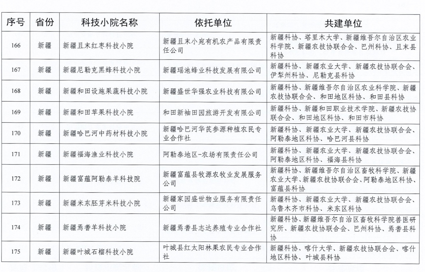 天山网-新疆日报讯(记者谢慧变报道)近日,中国农村专业技术协会公布新一批科技小院名单,新疆新增30家。截至目前,全疆累计建成中国农技协科技小院101家,涵盖100家区内小院和1家中亚海外科技小院,覆盖了全疆所有县(市、区)。 自2021年启动建设以来,新疆科技小院始终聚焦服务“三农”,围绕实现县域全覆盖、主要农业产业品种全覆盖和技术服务全覆盖持续发力。服务范围涵盖小麦、水稻、玉米等主粮作物,棉花、薰衣草、中药材等经济作物,红枣、葡萄、核桃等特色林果等,围绕主要农业产业构建起从种植、养殖到采收、加工、储运、冷链的全产业链技术服务体系,为各类新型农业经营主体提供精准化、系统化的科技支撑。 在扎实推进全产业链技术服务的同时,新疆科技小院围绕农业现代化高质量发展目标,聚焦人才培养、成果转化、社会服务等工作,创新采用“科协+高校+科研院所+企业+农户”共建模式,联合新疆农业大学、塔里木大学、石河子大学、自治区农业科学院等多所高校与科研机构,累计选派101名首席专家、200余名研究生常驻一线。截至目前,已累计开展技术培训300余场,培训农技人员及农民超过2万人次,组织田间指导500多次,技术辐射面积突破100万亩,切实打通农业技术推广“最后一公里”。 在深耕本土服务的同时,新疆科技小院将目光投向更广阔的国际舞台。2024年9月,由新疆牵头建设的中国农技协乌兹别克斯坦中药科技小院正式落地,成为全国第二个海外科技小院。依托中乌医药科技城平台,该小院已推动5款新药在乌兹别克斯坦实现本地化生产,将新疆科技小院的成功经验推广至共建“一带一路”国家,为国际农业科技合作贡献“中国智慧”。 自治区科协相关负责人表示,下一步,新疆科技小院将围绕“稳粮、优棉、强果、兴畜、促特色”的农业发展战略,持续完善体系建设、优化运行机制,强化科技与人才支撑,推动产学研用深度融合,为全区农业农村现代化和乡村全面振兴注入更强动力。 附:新疆新获批的30家中国农技协科技小院名单