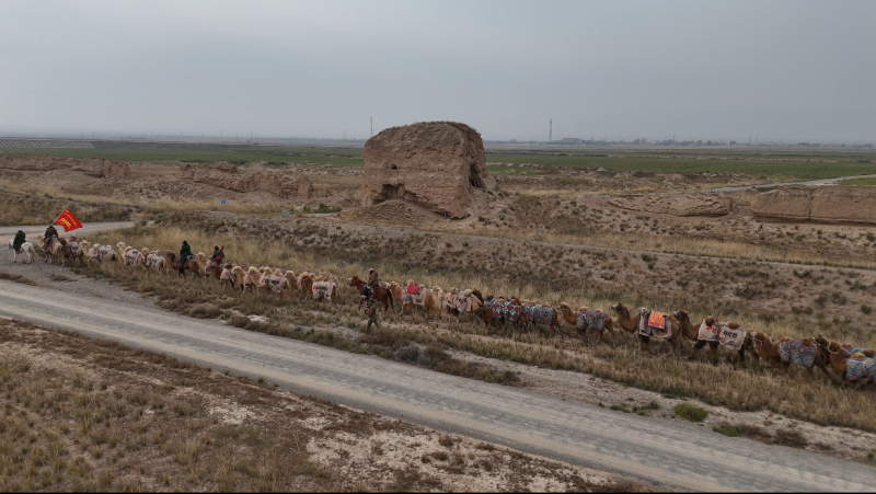 驼队成为沿途一道美丽的风景。严新龙摄 “走一路,学一路,感动一路。我们感动别人,也被别人感动。”蒋晓亮说。最初计划每天行进50公里,实际因骆驼行进速度比预期慢,加上举办的文化交流活动,每天行程约30公里,从9时一直持续到18时。虽然很辛苦,但队员们乐在其中,在行走中感受丝路的历史厚度与人文温度。 古老丝路的“现代传播” 驼队的行程丰富而充实。10月30日,驼队抵达甘肃省武威市,一场别开生面的文旅交流活动在此展开。天祝藏族自治县文旅部门专程带领40余名演职人员前来助阵。黑走马的欢快节奏、锅庄舞的热烈奔放、西凉乐舞的古典韵味轮番上演,为观众带来一场视听盛宴。活动现场,凉州大月饼、面皮子等甘肃特色美食和哈密大枣、葡萄干等新疆特产同台亮相,在味觉与视觉的交融中,奏响了一曲文旅交流乐章。 10月31日,驼队探访了武威市沙漠公园和沙漠野生动物园等景区;11月1日,全体队员专程乘车前往民勤县参与植树活动;11月2日,驼队与武威市当地景区马队及游客开展了摔跤、登山、赛马、拔河等比赛,载歌载舞的篝火晚会更是将氛围推向高潮。 这支驼队不仅在重走历史,更传播着丝路文化。队里70%的队员在抖音等平台直播、制作短视频,用不同视角记录旅途。 蒋晓亮出发时,个人账号粉丝量有9万多,如今已增至12.9万,他每天用手机拍摄、剪辑,至少更新1条视频,几乎天天直播。 程巍已发布近200条视频,直播成为日常。他说:“以前骆驼是运输工具,现在我们用‘慢行+网络’的方式,让更多人看到沿线的精彩,了解真实的新疆,这特别有意义。”每到一地,他们还会和当地自媒体人交流,学习不同的传播技巧。 43岁的叶思木汗·卡买力汗是巴里坤县的牧民,家里早已换成汽车、摩托车代步,这次是他第一次长距离骑骆驼。一路上,他高举队旗,“队旗上之前印着‘东天山来的骆驼队’,很多人问‘东天山在哪儿’,所以我们后来特意在队旗上又加上了‘新疆’二字。”叶思木汗说,看着越来越多人通过驼队知道家乡,他满心骄傲。 如今,这支队伍正继续向东行进,用驼铃唤醒千年丝路记忆,让古老的丝路精神在新时代焕发新生。
