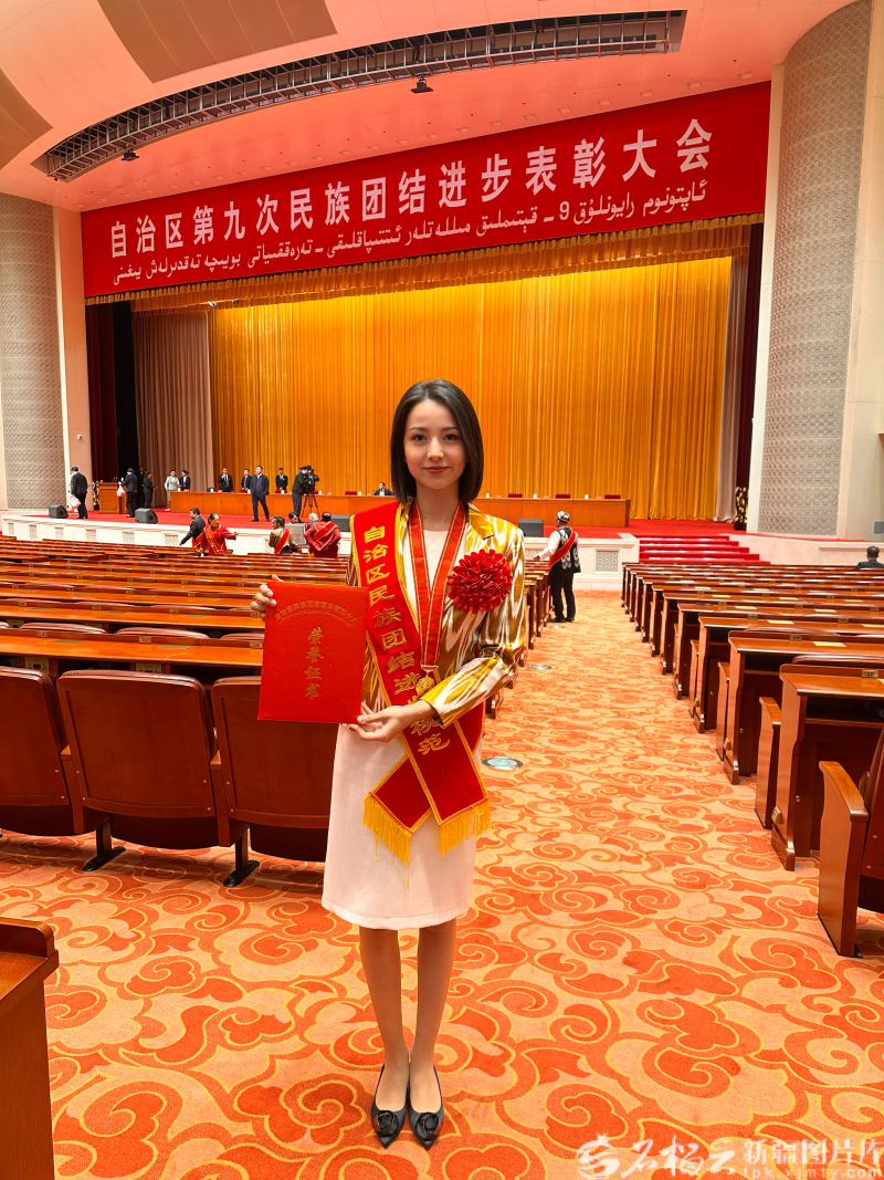 10月16日,帕丽巴克·激浪在自治区第九次民族团结进步表彰大会现场。受访者供图 帕丽巴克2012年大学毕业时,新疆维吾尔自治区博物馆招聘讲解员,她想试试,为了通过考核,她每天在展厅听前辈讲解、记下要点,回家后对着镜子练习姿态和语调。 为了避免在讲解工作中,因历史知识储备不足而陷入尴尬,她反复研读史料,查阅中外文献,向专家请教。随着理解的加深,她逐渐认识到,文物背后的不仅是历史,更是民族交往的印记。“讲解员不是专家,却要讲清楚;不是导游,却要一站一整天;不是主持人,却要让观众愿意听。”她说。