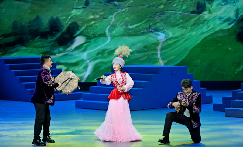 《青川河》在第二十届群星奖亮相。伊犁哈萨克自治州文化馆供图 演出现场,三位年轻艺人的演唱方式令人印象深刻。舞台布置简洁大方,女主唱丁娜·阿扎提站在中央,两位男演员苏力探和乌拉哈提分列左右,分别演奏冬不拉和萨孜斯尔乃(哈萨克族陶笛)。 “能够站在全国的舞台上演唱家乡的民歌,我们既紧张又自豪。”丁娜·阿扎提说。作为一名常年活跃在基层的民间艺人,她将歌声献给家乡的父老,也全身心投入于民间艺术的传承之中。而与她同台的两位00后男孩,大学毕业后便加入团队中,在近一年的巡演磨砺中,他们对音乐的理解也逐渐从技巧走向情感,从表演走向表达。 在所有演出经历中,最令丁娜难忘的是今年5月在贵阳的那一场,“那天雨下得很大,可观众没有一个提前离开。我们在台上冒雨演唱,他们在台下撑伞聆听,那一刻,音乐成为我们沟通的桥梁。”