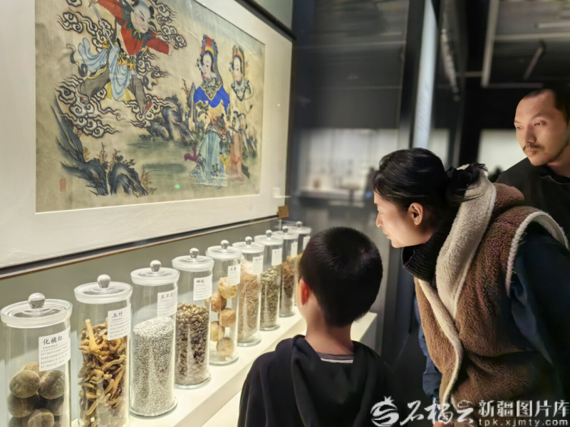 11月8日,在新疆博物馆,参观者在了解各种中药材。 “中医药是我国重要的文化遗产之一,希望把更多中医药文化遗产保护、弘扬下去。”来自南京的游客王宇说道。