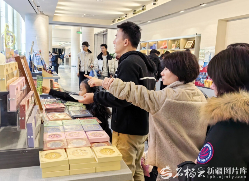 11月8日,在新疆博物馆,游客在选购各种文创产品。 该展览以中医药文化为主线,精心遴选200余件(套)文物藏品,按照“文明之钥”“摄生之道”“灵兰秘典”“器药撷英”“传承创新”五个单元,通过文物、藏品、药材及图文资料,多维度展现中医药的历史进程、文化底蕴和特色优势,深刻展现中医药自主知识体系的形成、演进过程和对人类的独特贡献。
