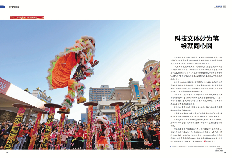 10月6日,新疆国际大巴扎景区,游客近距离感受“非遗龙狮庆华诞”展演。李瑞/摄 遍及天山南北的科技服务、体育赛事与文化盛宴,正是对习近平总书记殷切嘱托的响亮回答。这份为中国人民谋幸福,为中华民族谋复兴的初心使命,通过一件件民生实事的扎实落地,在新疆辽阔大地上,书写着温暖而坚定的时代答卷。 千名科技人员奔赴基层,农业科技园区传经送宝,超百个公共体育场馆敞开门扉,数以万场的群众文化活动精彩纷呈……这一项项目标明确、惠及广泛的举措,如春风化雨,编织着一幅民生福祉与社会活力交织的锦绣画卷。 这些根植生活、形式多样的活动,从三个维度,让铸牢中华民族共同体意识更深入人心: 它将宏阔叙事融入烟火日常,让“中华民族一家亲”的理念,在一次技术指导、一场激烈竞逐、一次文物凝视中,变得可知可感; 它搭建起交往交流交融的宽阔舞台,赛场上的拼搏与呐喊,展示着同心同行的奋进与骄傲;舞台下的会心一笑,传递着深切的理解; 它在携手奋斗中凝聚前进伟力。当科技的种子在田野破土,当运动的热情联通彼此心灵,当文化的血脉贯通古今,各民族的情感便愈发相亲,团结的纽带便愈发牢固。这份在共同参与中淬炼的情谊,正汇聚成共同团结奋斗、共同繁荣发展的磅礴力量,让中华民族共同体的大树枝繁叶茂、根基永固。 【继续阅读】 “小”变化带来“大”幸福——新疆科技文体惠民行动润泽千家万户 “小”院里的“大”文章 “小”足球转动“大”团结 乌鲁木齐:惠民沃土中绽放的“雪莲花” 深入推进文体科技协同赋能 铸牢中华民族共同体意识