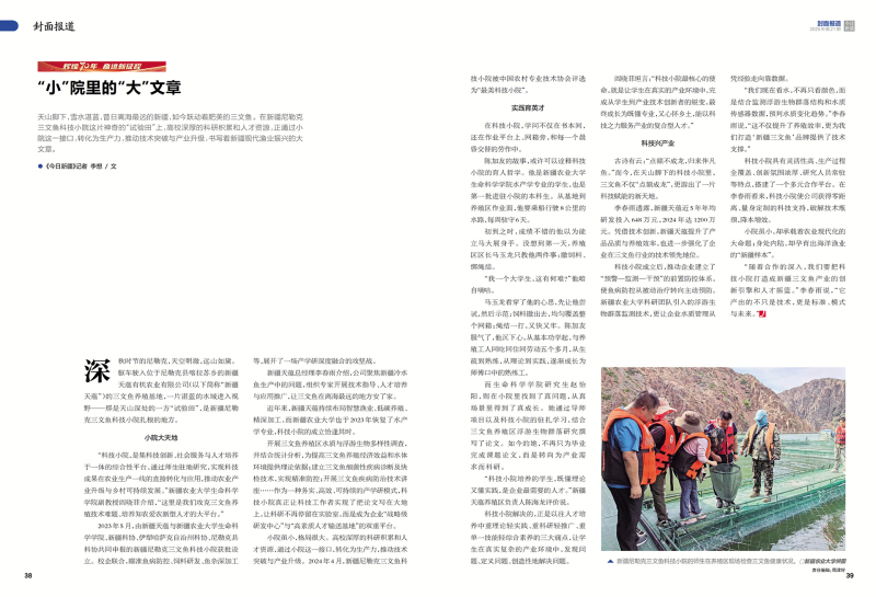 新疆尼勒克三文鱼科技小院的师生在养殖区现场检查三文鱼健康状况。新疆农业大学供图 小院大天地 “科技小院,是集科技创新、社会服务与人才培养于一体的综合性平台,通过师生驻地研究,实现科技成果在农业生产一线的直接转化与应用,推动农业产业升级与乡村可持续发展。”新疆农业大学生命科学学院副教授阎晓菲介绍,“这里是我们攻克三文鱼养殖技术难题、培养知农爱农新型人才的大平台。” 2023年5月,由新疆天蕴与新疆农业大学生命科学学院、新疆科协、伊犁哈萨克自治州科协、尼勒克县科协共同申报的新疆尼勒克三文鱼科技小院获批设立。校企联合,瞄准鱼病防控、饲料研发、鱼杂深加工等,展开了一场产学研深度融合的攻坚战。 新疆天蕴总经理李春雨介绍,公司聚焦新疆冷水鱼生产中的问题,组织专家开展技术指导、人才培养与应用推广,让三文鱼在离海最远的地方安了家。 近年来,新疆天蕴持续布局智慧渔业、低碳养殖、精深加工,而新疆农业大学也于2023年恢复了水产学专业,科技小院的成立恰逢其时。 开展三文鱼养殖区水质与浮游生物多样性调查,并结合统计分析,为提高三文鱼养殖经济效益和水体环境提供理论依据;建立三文鱼细菌性疾病诊断及快检技术,实现精准防控;开展三文鱼疾病防治技术讲座……作为一种务实、高效、可持续的产学研模式,科技小院真正让科技工作者实现了把论文写在大地上,让科研不再停留在实验室,而是成为企业“战略级研发中心”与“高素质人才输送基地”的双重平台。 小院虽小,格局很大。高校深厚的科研积累和人才资源,通过小院这一接口,转化为生产力,推动技术突破与产业升级。2024年4月,新疆尼勒克三文鱼科技小院被中国农村专业技术协会评选为“最美科技小院”。 实践育英才 在科技小院,学问不仅在书本间,还在作业平台上、网箱旁,和每一个晨昏交替的劳作中。 陈加友的故事,或许可以诠释科技小院的育人哲学。他是新疆农业大学生命科学学院水产学专业的学生,也是第一批进驻小院的本科生。从基地到养殖区作业面,他要乘船行驶8公里的水路,每周驻守6天。 初到之时,成绩不错的他以为能立马大展身手。没想到第一天,养殖区区长马玉龙只教他两件事:撒饲料、绑绳结。 “我一个大学生,这有何难?”他暗自嘀咕。 马玉龙看穿了他的心思,先让他尝试,然后示范:饲料撒出去,均匀覆盖整个网箱;绳结一打,又快又牢。陈加友服气了,他沉下心,从基本功学起,与养殖工人同吃同住同劳动五个多月,从生疏到熟练,从理论到实践,逐渐成长为师傅口中的熟练工。 而生命科学学院研究生赵怡阳,则在小院里找到了真问题,从真场景里得到了真成长。她通过导师项目以及科技小院的驻扎学习,结合三文鱼养殖区浮游生物群落研究撰写了论文。如今的她,不再只为毕业完成课题论文,而是转向为产业需求而科研。 “科技小院培养的学生,既懂理论又懂实践,是企业最需要的人才。”新疆天蕴养殖区负责人陈海龙评价说。 科技小院解决的,正是以往人才培养中重理论轻实践、重科研轻推广、重单一技能轻综合素养的三大痛点,让学生在真实复杂的产业环境中,发现问题、定义问题、创造性地解决问题。 阎晓菲坦言:“科技小院最核心的使命,就是让学生在真实的产业环境中,完成从学生到产业技术创新者的蜕变,最终成长为既懂专业,又心怀乡土,能以科技之力服务产业的复合型人才。” 科技兴产业 古诗有云:“点额不成龙,归来伴凡鱼。”而今,在天山脚下的科技小院里,三文鱼不仅“点额成龙”,更游出了一片科技赋能的新天地。 李春雨透露,新疆天蕴近5年年均研发投入648万元,2024年达1200万元。凭借技术创新,新疆天蕴提升了产品品质与养殖效率,也进一步强化了企业在三文鱼行业的技术领先地位。 科技小院成立后,推动企业建立了“预警—监测—干预”的前置防控体系,使鱼病防控从被动治疗转向主动预防。新疆农业大学科研团队引入的浮游生物群落监测技术,更让企业水质管理从凭经验走向靠数据。 “我们现在看水,不再只看颜色,而是结合监测浮游生物群落结构和水质传感器数据,预判水质变化趋势。”李春雨说,“这不仅提升了养殖效率,更为我们打造‘新疆三文鱼’品牌提供了技术支撑。” 科技小院具有灵活性高、生产过程全覆盖、创新氛围浓厚、研究人员常驻等特点,搭建了一个多元合作平台。在李春雨看来,科技小院使公司获得零距离、量身定制的科技支持,破解技术瓶颈,降本增效。 小院虽小,却承载着农业现代化的大命题;身处内陆,却孕育出海洋渔业的“新疆样本”。 “随着合作的深入,我们要把科技小院打造成新疆三文鱼产业的创新引擎和人才摇篮。”李春雨说,“它产出的不只是技术,更是标准、模式与未来。”