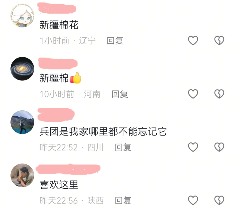 今年10月,在库车市二八台镇的棉田,大型采棉机轰鸣前行,匀速作业。卜登鹏 摄 近年来 兵团深入贯彻落实 国家粮食安全战略部署 积极推动种植制度创新 大胆探索粮棉轮作模式 2024年 新疆农垦科学院在麦盖提县 库尔玛乡红光村创建的 麦后直播棉花试验示范田 籽棉平均亩产突破300公斤 标志着兵团麦后复播 棉花技术取得成功 此次 兵团麦后复播棉花单产 创造我国干旱区高产纪录 对于完善我国干旱区“两年三熟” 种植制度具有重要意义 网友们也纷纷为新疆棉花点赞: