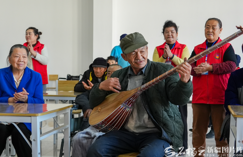 石榴云/新疆日报记者 杜建辉 12月3日,尉犁县中心敬老院的活动室里,冬日暖阳透过新装的窗帘铺满每一个角落。塔里木乡塔里木村村民奥斯曼·约麦尔怀抱都塔尔端坐着,手指拨弦,旋律动人。工作人员与老人们围坐一圈,跟着节奏轻声哼唱。