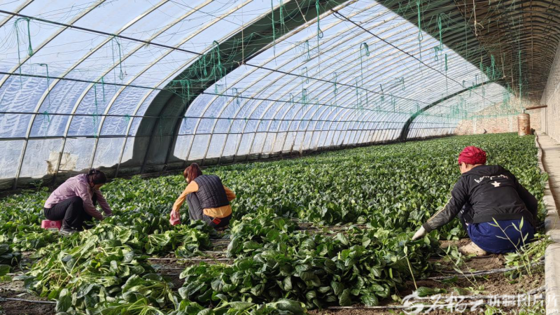 在沙雅县托依堡勒迪镇铁热克村,村民们正在采摘菠菜,准备运往市场销售。王永江 摄