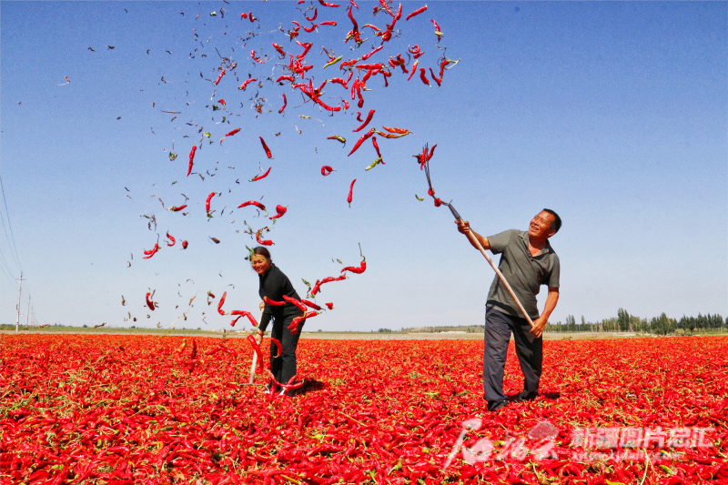 红色是新疆丰收色谱中最耀眼的一种 大片大片火红的辣椒摊晒在地面上 宛如一块块红色拼图 形成一道独特的风景