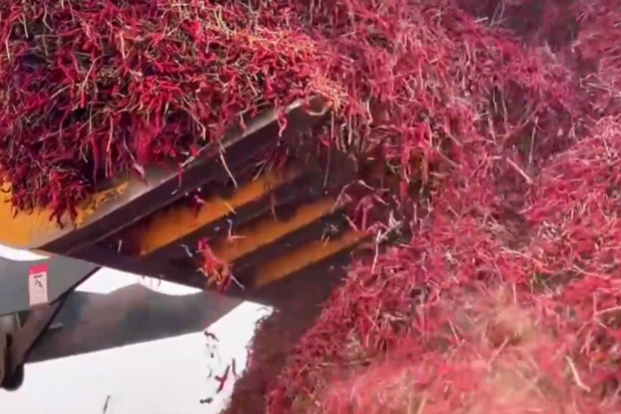 近日 塔克拉玛干沙漠北缘 兵团第一师五团 300吨辣椒正在进行一系列加工 晾晒后的辣椒风味更佳 每天加工约2吨 经过剪把、色选等 这些辣椒将销往陕西、四川等地