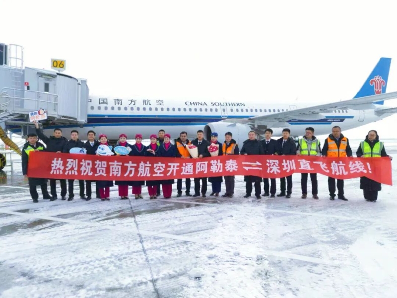 南航机组及工作人员共同手持横幅,庆祝深圳—阿勒泰直飞航线正式开通,标志着北上广深四大一线城市与“人类滑雪起源地”的直飞网络全面贯通。