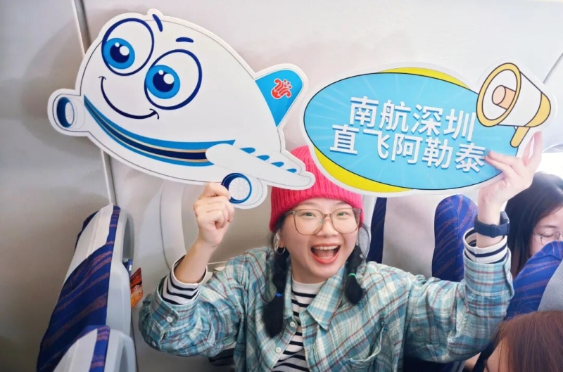 深圳⇌阿勒泰直飞首航航班上,乘客手持主题标识牌,难掩兴奋与期待。
