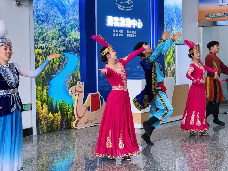 阿勒泰雪都机场游客集散中心内,身着民族服饰的演员们用欢快舞蹈迎接首航旅客,以浓郁的地域风情开启游客的阿勒泰冰雪之旅。
