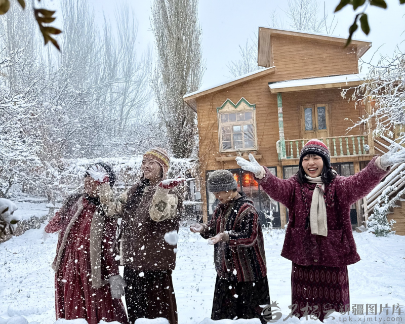 12月10日,四宫村下起了大雪,田群芝(右二)和游客在雪地中嬉戏。图片由本人提供
