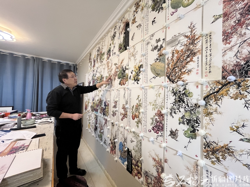 12月22日,崔逢春在画室介绍他的瓜果画作。石榴云/新疆日报记者 郭宏磊摄