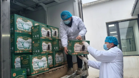 工作人员有条不紊地将封装完毕的巴音布鲁克牛羊肉搬上冷藏车。