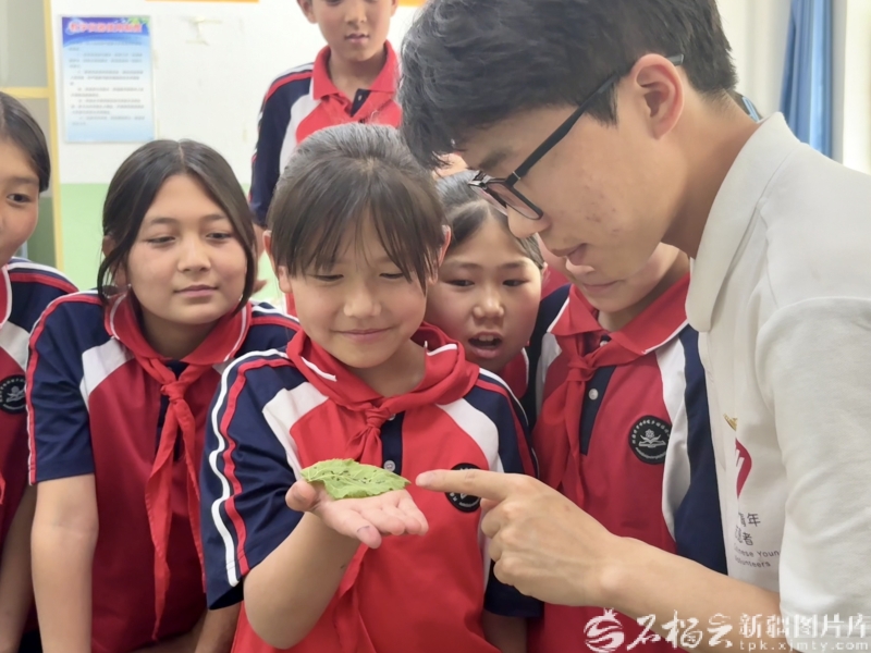 志愿者姚智戈在科学课上带学生观察树叶(资料图)。图/谢依特小学提供